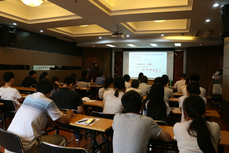 刘默芳研究员对piRNA在哺乳动物精子发生中的功能机制进行了详细的讲解,在无精症患者中发现了一类拮抗人PIWI(HIWI)蛋白泛素化修饰和降解的突变,并通过小鼠模型证明此类突变足以导致雄性不育,进一步揭示此类突变使得PIWI蛋白在后期精子细胞中异常稳定,进而致使与其相互作用的组蛋白泛素连接酶RNF8被扣留胞质、不能入核泛素化修饰组蛋白,从而阻碍了精子变形过程中的组蛋白-鱼精蛋白交换及精子形成。刘默芳研究员的讲解深入浅出,通俗易懂又充满乐趣,在座的教师与同学们都获益匪浅。
