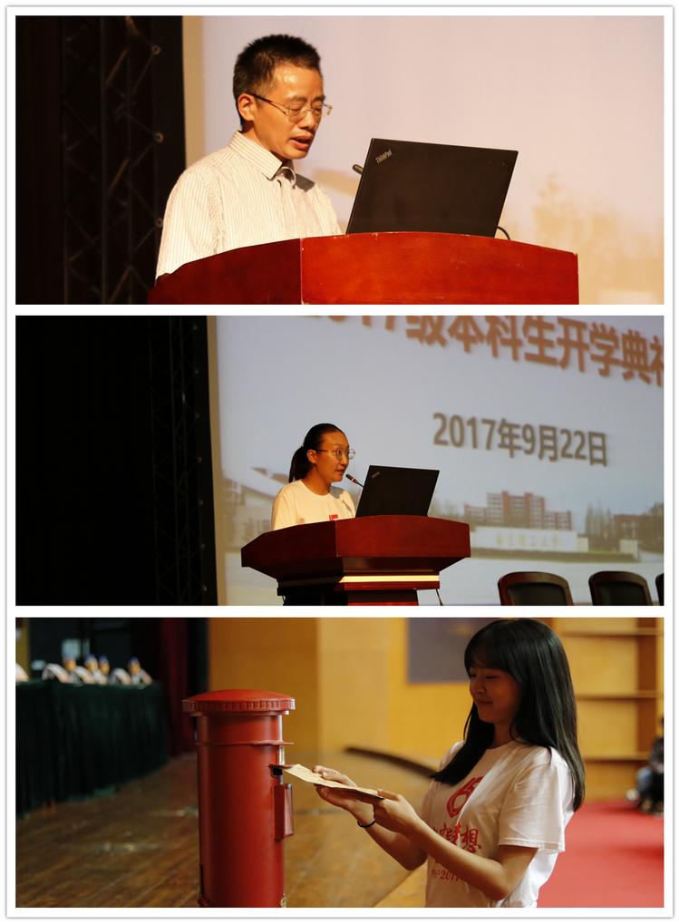 2017新生开学典礼精心设置了“我的生工+”特别环节,357名新生撰写了“致四年后的自己的一封信”,由新生代表南妍、陈滟陇投递至特制信桶内,最后由院长庄英萍和学生代表陈宇清共同封存,激励同学们用四年的时光书写更美好的自己。