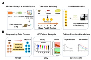 的研究成果。科研人员利用转座元件构建突变株文库,使用突变株文库对大菱鲆进行腹腔感染,在感染的不同阶段进行回收突变株,利用高通量测序进行对文库中突变株的丰度变化进行检测。实验结果显示已知的三型和六型分泌系统在感染初期并非必需基因,而到感染后期成为条件必需基因。本研究的创新点在于对Tn-seq技术进行改进,开发出了多时间点的聚类分析方法(PACE, Pattern Analysis of Conditional Essentiality)。使用该方法,可以对突变株在多个时间点的动态变化过程进行分类,并在全基因组范围内评价每个编码基因(位点)对于该菌在体内感染过程的贡献。同时,利用已知减毒活疫苗靶点基因的动态模型,寻找到了新的优良候选疫苗靶点基因,为疫苗理性设计提供了新的思路。