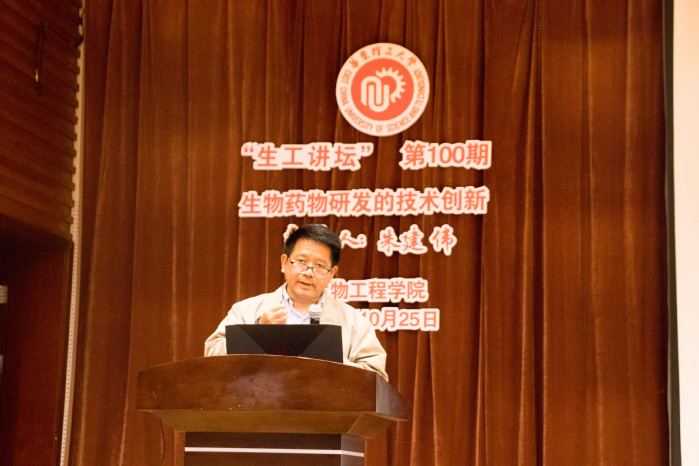 一段回顾生工讲坛12年发展历史的暖场视频拉开了活动帷幕,多位与这一品牌活动结缘深厚的师生们送上了祝贺。嘉宾朱建伟教授首先提及了与母校的缘分,在20年前庆祝母校46岁华诞之时他也是作为嘉宾前来开讲,这次再度回归母校,来到奉贤校区,感受到了年轻校友们的青春活力和华理近些年的蓬勃发展。他随后从时间维度围绕“生物药物研发的技术创新”这一主题依次展开,从解放初期的抗生素生产讲到80年代后DNA重组药物的技术革新,再到如今生物制药注册与销售数量的大幅增长、中国本土生物制药逐渐起步等方面提及生物制药产业具有的光明前景。此外,朱建伟还指出研发过程中生产的药品种类多样,但最终得到许可上市的产品往往只有一种,可见淘汰率之高,因此科学界一直致力于寻求更快更好的方法去筛选出效果不太好的药物。而在这一领域,朱建伟团队的基因定向放置技术与双抗技术对于筛选效率的提高有很大帮助。