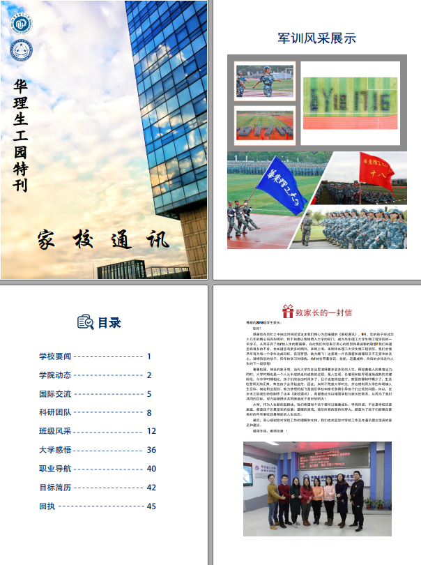 通过制作“家校通讯”这本刊物,在沟通与分享中让家校关系变得更加亲近。《家校通讯》聚焦学生成长经历,由学校要闻、学院动态、国际交流、科研团队、班级风采、大学感悟、职业导航、目标简历以及师长寄语等多个板块组成,而这本刊物也得到了众多家长的认可,接近100%的家长给予了热情的反馈。