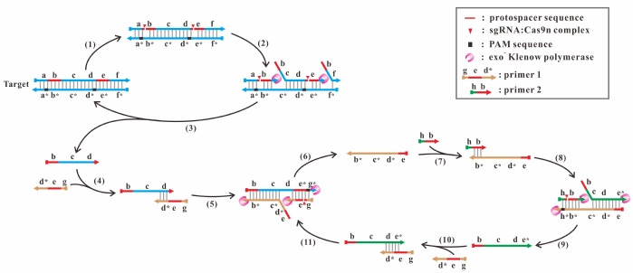 基因扩增反应在分子生物学和临床诊断等领域是一种非常有价值的重要技术。应用最为广泛的是1993年获得诺贝尔化学奖的聚合酶链式反应(PCR),但是PCR技术需要依赖控温精确的热循环仪器,使得以PCR为基础的基因扩增技术不适用于现场快速检测。基因等温扩增技术由于不需要温度变化操作,摆脱了对热循环仪器的依赖,在临床诊断和现场快速诊断中展示了巨大的应用前景。而现有的基因恒温扩增技术虽然解决了PCR方法依赖的热循环反应,但它们仍需要初始热变性操作来分离核酸双链结构,或多种蛋白酶、特殊反应试剂参与反应,或复杂的引物设计。因此,开发高效的基因扩增机制、操作便捷、灵敏度高、检测成本低的基因等温扩增方法仍然是一个挑战。