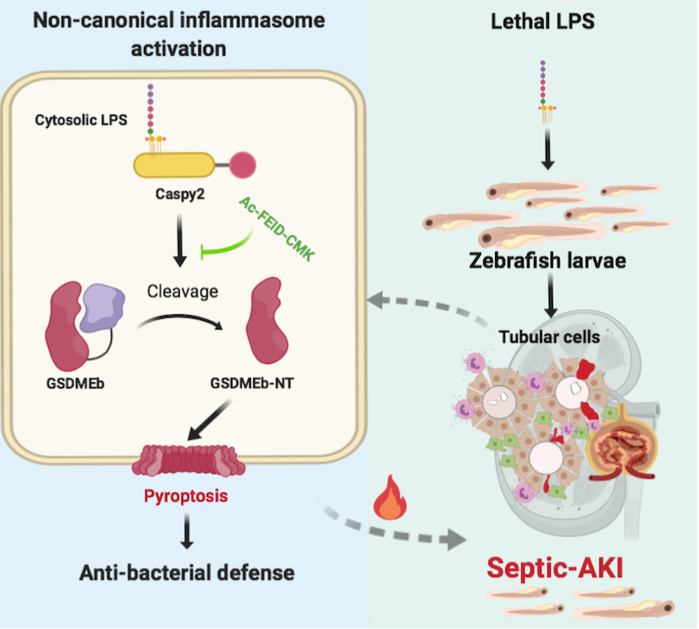 进一步,基于实验鱼活体脓毒性休克模型,立足细胞焦亡信号调控分子的系统筛选,课题组从脓毒症AKI发生的病理生理特性角度出发,深入解析了引发肾小管细胞焦亡的关键分子,发现Caspy2-GSDMEb介导的鱼类肾小管上皮细胞焦亡是引发脓毒症急性肾损伤的关键。并且,在小鼠活体模型上,验证了细胞焦亡信号调控脓毒症AKI的关键指标。据此,课题组设计了斑马鱼GSDMEb切割位点的竞争性肽抑制剂Ac-FEID-CMK,在活体水平上明确了该焦亡信号通路抑制剂能够有效缓解鱼体脓毒症AKI及鱼体死亡。这一成果从活体水平阐明了细胞焦亡信号调控脓毒症AKI发生的分子机制,不仅解析了鱼类细胞焦亡信号通路为代表的固有免疫系统的演化规律,也为重症脓毒性AKI患者的临床诊疗提供理论依据,为开发具有选择性的治疗脓毒症AKI药物提供新的研究策略。