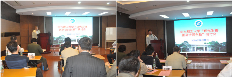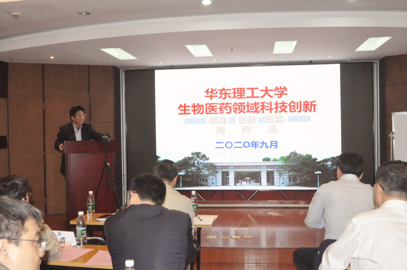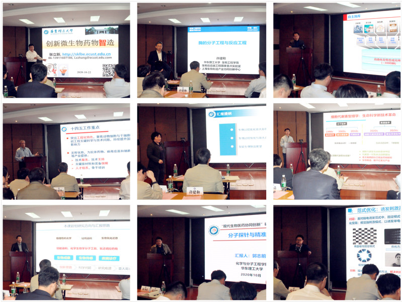 教授张立新、许建和、魏东芝、谭文松、庄英萍分别从创新微生物药物制造、酶的分子工程与过程工程研究、定制酶与细胞工厂促进绿色生物制造、动物细胞培养在生物医药领域的应用、生物过程优化放大理论与实践五个方面做了专题汇报。药学院教授杨弋、杨有军针对细胞代谢分析与调控技术、面向生物医药的染料分子工程研究进行了汇报。化分学院教授郭志前从分子探针与精准诊疗方面、信息学院教授金晶从基于脑机接口的康复技术及其应用方面进行了汇报。
