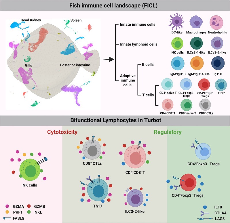 以上述产业需求为导向,课题组以大菱鲆为对象,基于Iso-Seq技术完善了大菱鲆转录组数据库,提升了大菱鲆基因的结构和功能注释质量(Marine Genomics 2022),并在此基础上,通过单细胞转录组测序技术建立了迄今为止种类最丰富的鱼类免疫细胞图谱:成功鉴定了巨噬细胞、中性粒细胞、类树突状细胞、自然杀伤细胞和两种固有淋巴细胞(ILCs3-1-like 和ILCs3-2-like),明确了十类T/B细胞亚群(包括IgM+IgD+ B细胞、IgM+IgD+浆细胞、IgT+ B细胞、CD4+ 幼稚T细胞、CD4+ Foxp3+ 和CD4+ Foxp3-调节性T细胞、Th17细胞、CD8+ 幼稚T细胞、CD8+细胞毒T细胞和CD4-CD8- T细胞),并分析了上述鱼类免疫细胞的潜在标志分子,为针对性解析相关免疫细胞的功能提供了公共资源。