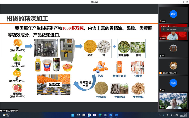 70周年校庆报告活动暨第二十六期俊棠论坛。单杨院长作了题为“柑橘功能性成分的营养与健康”的学术报告,报告会由科学技术发展研究院院长赵黎明教授主持,生物反应器工程国家重点实验室主任张立新教授等近300名校内外师生在线聆听了报告。