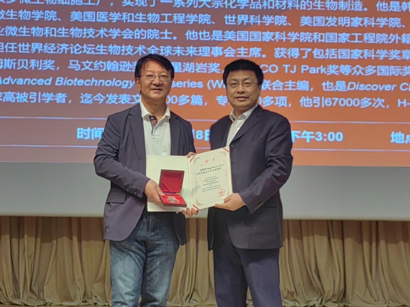 报告结束后,生物反应器工程国家重点实验室主任张立新为Sang Yup Lee教授颁发了“俊棠论坛”纪念奖牌和名誉教授聘书,为其与国重室建立的长期交流与合作表示诚挚感谢,并希望以他深厚的学术造诣、创新的科研理念,为国重室重组的科研工作及国际化合作提供战略指导与帮助。